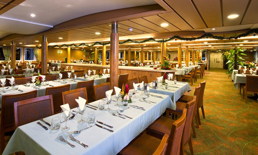 When you cruise aboard Aranui 5 you won’t be assigned a table. At each meal you can choose to sit where you like, and with whom. This is a great way to meet as many possible on your cruise as possible! Travellers wishing to sit together should arrive early to select where they would like to be located as seating can fill fast.